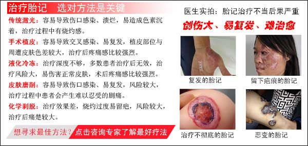 目前治疗胎记的方法非常的多,其中包括冷冻治疗、药物治疗以及外科手术(磨皮术或植皮)等,然而这些传统方法弊端很多,很难将胎记有效治疗,胎记患者应慎重选择。
